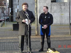 "Die Feuerwehr Mainz rettet Leben - Hilfe einmal anders!" Unter diesem Motto fand am heutigen Silvestermorgen zum 36. Mal das Abschwimmen der Feuerwehr Mainz statt. 37 Taucherrinnen und 162 Taucher von Feuerwehr, DLRG, Polizei und privaten Tauchclubs aus dem gesamten Rhein-Main-Gebiet sprangen nach dem Startschuss durch den Brandschutzdezernenten Wolfgang Reichel vom Feuerlöschboot Franz Anton Schneider in die 7,0°C kalten Fluten des Rheins. Bei Außentemperaturen von 9°C und Sonnenschein waren die Zuschauer zahlreich am Rheinufer erschienen.