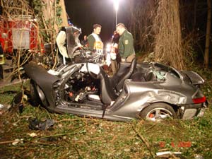 Vermutlich infolge nicht angepasster Geschwindigkeit kam ein Porsche am Dienstag abend gegen 20.40 Uhr in der Heidesheimer Straße in Mainz-Gonsenheim nach links von der Straße ab. Der Wagen berührte ein Hinweisschild und prallte 40 Meter weiter frontal gegen einen massiven Baum. Der Anprall war so stark, dass der Baumstamm in etwa 8m Höhe in der Mitte gespalten wurde. Das im Auto sitzende Ehepaar wurde schwer verletzt und zwischen verformten Blech eingeklemmt.