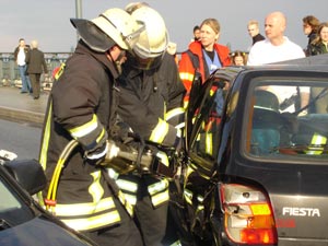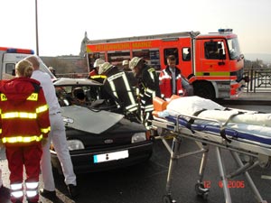 Am 12.04.2006, um 17.56 Uhr wurde die Feuerwehr Mainz zu einem Verkehrsunfall auf der Theodor-Heuss-Brücke alarmiert. An dem Unfall, dessen Hergang noch unklar ist, waren insgesamt vier Fahrzeuge beteiligt. Eine Fahrerin wurde in ihrem Fahrzeug eingeklemmt. Die etwa 30-jährige Fahrerin musste von Einsatzkräften der Feuerwehr mit einem Rettungsspreizer und der Rettungsschere, in Zusammenarbeit mit dem Notarztteam unter medizinischer Versorgung, aus dem völlig deformierten Fahrzeug befreit werden. Das Notarztteam brachte die Frau anschließend in eine Mainzer Klinik. Weitere 4 Personen wurden mit leichten Verletzungen vom Rettungsdienst versorgt. Die Polizei hat die Ermittlungen zur Unfallursache aufgenommen. Die Höhe des entstandenen Sachschadens ist noch unbekannt.
