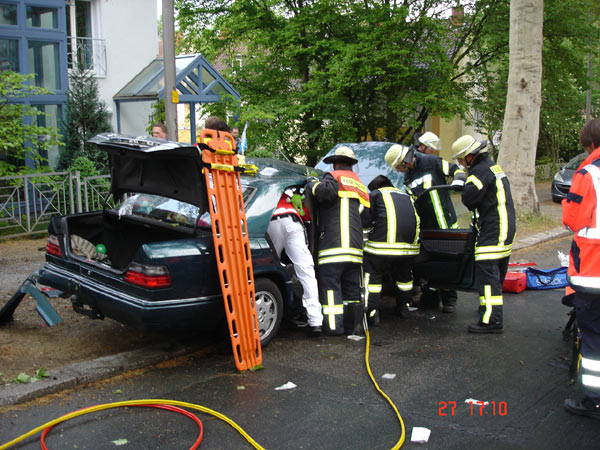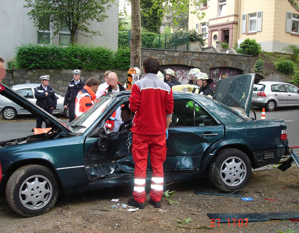 Durch den Aufprall war die Fahrerseite der Mercedes stark deformiert. Um den schwerverletzten Fahrer möglichst behutsam aus dem demolierten Fahrzeug zu befreien setzten die Einsatzkräfte der Berufsfeuerwehr hydraulisches Rettungsgerät ein. Parallel hierzu wurde der junge Fahrer vom anwesenden Notarzt und Rettungsdienst versorgt.