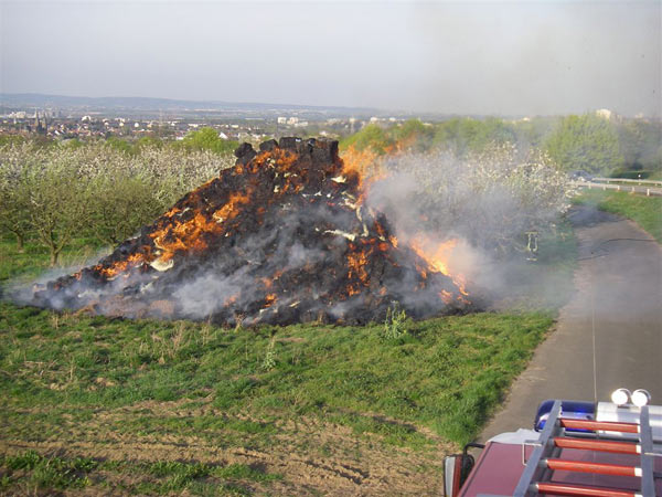 Von einer großen Zahl Autofahrern, die auf der Saarstraße und der BAB 60 unterwegs waren, wurde um 18:31 Uhr ein Brand von Strohballen auf einem Feld neben der Saarstraße, kurz vor der Ortsgrenze Finthen gemeldet.