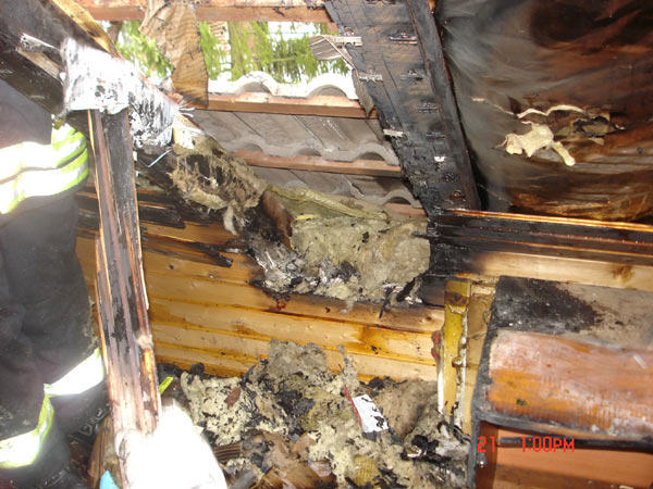 Die Erkundung in der rechten Doppelhaushälfte (DHH) durch einen weiteren Trupp ergab, dass dort kein Feuer ausgebrochen war, sich aber Rauch unter der Dacheindeckung ausgebreitet hatte. Durch die Bauweise des Daches bestand aber die Gefahr, dass sich der Brand auf die Dächer beider Häuser ausbreitet.