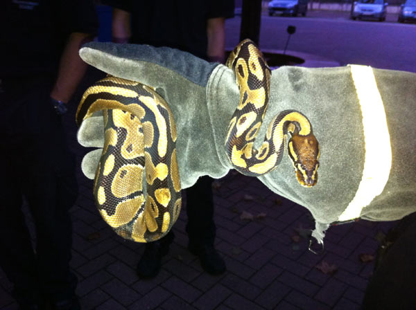 Ein aufmerksamer Bürger hat am Sonntagabend eine ca. 100 cm große Schlange am Geiersköppelweg in Mainz-Finthen gefunden und in einem Eimer gefangen. Die Feuerwehr wurde verständigt um das Tier aufzunehmen. Durch die Feuerwehrleitstelle wurde ein Schlangen-Experte hinzugezogen, der sich des Tieres annahm. Er stellte auch fest, dass es sich um eine Königspython handelte. Der Sachverständige wird die Schlange zunächst ein paar Tage sicherstellen und dann, sofern sich kein Besitzer meldet, einem Zoo zuführen.