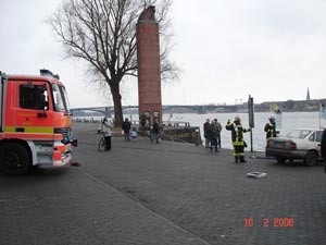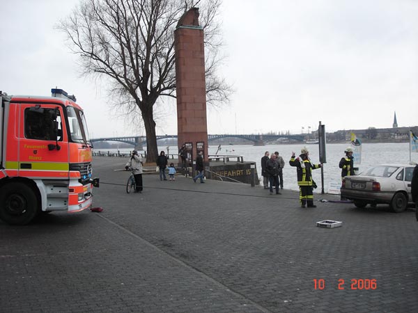 Glücklich ging am Freitagnachmittag der Irrtum eines jungen PKW-Fahres aus. Um 15:34 Uhr wurde die Feuerwehr alamiert, ein PKW drohe am Fischtor in den Rhein zu stürzen. Der ortsunkundige Fahrer hatte die Rheinufertreppen anscheinend mit einer befahrbaren Rampe verwechselt. Glücklicherweise blieb das Fahrzeug mit seinem Unterboden an den ersten Stufen hängen. Der Fahrer und seine zwei Beifahrerinnen konnten sich aus dieser gefährlichen Situation mit eigener Kraft befreien. Die Feuerwehr sicherte das Fahrzeug mit einer Seilwinde und konnte es anschließend an das "rettende Ufer" ziehen. Nach der ganzen Aufregung, konnte der sichtlich schockierte Fahrzeugbesitzer mit seinen Begleiterinnen einen regulären Parkplatz suchen.