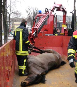 Am Fastnachtssonntag musste die Mainzer Berufsfeuerwehr am späten Vormittag in der Münsterstraße ein totes Pferd bergen. Das Pferd war noch vor dem Gardeumzug unter seinem Reiter tot zusammen gebrochen, auch ein sofort alarmierter Tierarzt konnte dem Tier nicht mehr helfen. Der rund 600 Kilogramm schwere Kadaver lag auf der Straße, mit Hilfe eines Wechselladerfahrzeuges mit Kran und einem speziellen Hebegeschirr, konnte er in eine bereit stehende Mulde gelegt werden. Im Anschluß daran wurde er nach Laubenheim verbracht.