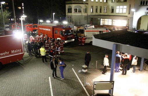 Am 27.02.2009 um 18.06 Uhr wurde der Feuerwehr Mainz über die automatische Brandmeldeanlage des Hildegardiskrankenhauses ein Brandalarm gemeldet. Auf Grund der unmittelbar danach eingehenden Notrufe, die über einen definitiven Brand im Krankenhaus berichteten, wurde umgehend das Alarmstichwort erhöht. Daraufhin wurden von der Feuerwehr-Leitstelle sofort zwei Löschzüge der Berufsfeuerwehr sowie die Freiwillige Feuerwehr Bretzenheim und Innenstadt alarmiert. Bereits auf der Anfahrt war der Brandrauch deutlich wahrnehmbar. Beim Eintreffen der ersten Kräfte kamen diesen bereits erste Patienten, die vom Klinikpersonal ins Freie gebracht wurden, entgegen. Auf Grund des massiven Brandrauches, der sich auch immer weiter im Bettenhaus verbreitete, wurde kurz nach dem ersten Eintreffen von der Feuerwehr Vollalarm ausgelöst. D.h. alle dienstfreien Kräfte der Berufsfeuerwehr sowie alle Freiwilligen Feuerwehren der Stadt Mainz wurden auf die Feuerwachen oder direkt an die Einsatzstelle alarmiert. Gleichzeitig wurden eine große Anzahl an Sanitäts- und Rettungsdienstkräften, darunter auch der Leitende Notarzt und der Organisatorische Leiter Rettungsdienst, alarmiert.