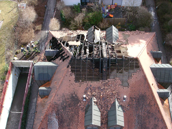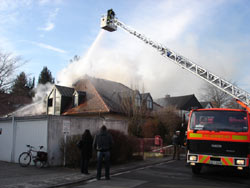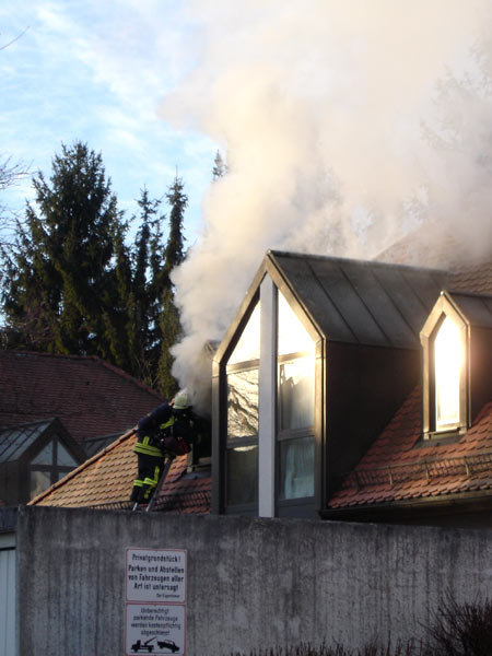 Der Brand war jedoch schon so weit fortgeschritten, dass er sich unter der Innenverkleidung und der Dacheindeckung fast über den gesamten Dachstuhl ausgebreitet hatte. Die Feuerwehr ging mit mehreren Trupps unter schwerem Atemschutz im Innenangriff sowie über zwei Drehleitern im Außenangriff vor, um das Feuer unter Kontrolle zu bringen.