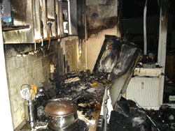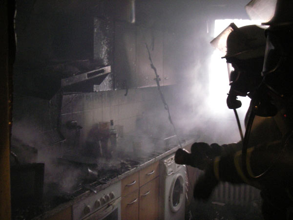 Vor Ort fanden die Einsatzkräfte eine brennende Küche im zweiten Obergeschoss eines Mehrfamilienwohnhauses vor. Die Feuerwehr setzte zum Absuchen der stark verrauchten Brandwohnung sofort einen Trupp unter Atemschutz ein. Glücklicherweise befanden sich die weiteren Bewohner zum Zeitpunkt des Brandes jedoch nicht in der Wohnung. Weitere Trupps, ebenfalls unter schwerem Atemschutz, kontrollierten das völlig verrauchte Treppenhaus und die Wohnungen in dem vierstöckigen Gebäude. Das Feuer konnte dann durch die Einsatzkräfte recht schnell mit einem C-Rohr gelöscht werden. Die starke Rauchentwicklung in der Wohnung wurde im Anschluss an die Löscharbeiten mit einem Hochleistungslüfter entfernt. Dennoch ist die Wohnung bis auf weiteres unbewohnbar. Der Mieter und seine Mitbewohnerin kamen bei Bekannten unter. Personen kamen glücklicherweise nicht zu Schaden, der entstandene Sachschaden wird auf mindestens 20.000 Euro geschätzt.
