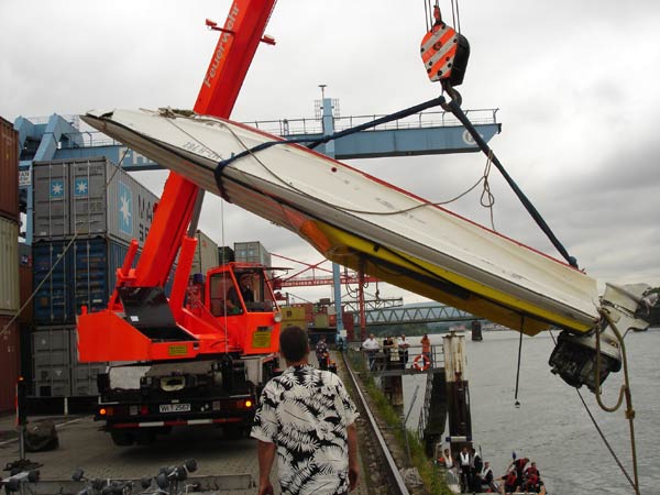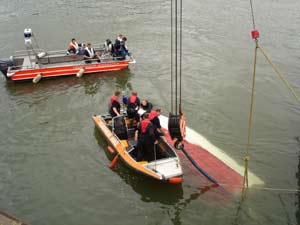In der Nacht zum Samstag kam es auf dem Rhein, in Höhe des Zollhafens, zu einer Kollision zwischen einem Schüttgutfrachter und einem Sportboot. Um 02.55 Uhr wurden die Einsatzkräfte der Feuerwehr und des Rettungsdienstes alarmiert. Auf dem Rhein war ein Sportboot, mit 2 Personen besetzt, in voller Fahrt frontal in die Seite eines Schiffes geprallt. Die Wucht des Aufpralls war so groß, dass die beiden Männer aus dem Boot geschleudert wurden und schwer verletzt im Wasser landeten. Die gleichzeitig alarmierte Wasserschutzpolizei konnte die Verletzten aus dem Wasser ziehen, bevor sie durch die Strömung abgetrieben werden konnten. Sie wurden dem am Ufer wartenden Notarzt übergeben und schwerverletzt in eine Mainzer Klinik gebracht. Die Feuerwehr sicherte das schwer beschädigte und inzwischen gesunkene Boot im Uferbereich gegen ein Abtreiben im Rheinstrom ab. Die Bergung des Sportbootes wurde wegen der Dunkelheit auf den Vormittag verschoben. Mit der Hilfe eines Feuerwehrkrans und Feuerwehrtauchern konnte das Sportboot am Samstagvormittag aud dem Wasser geborgen werden. Am Boot entstand Totalsdchaden, während der Schüttgutfrachter nur leichte Kratzer an der Bordwand hatte und seine Fahrt Rhein abwärts fortsetzen konnte.