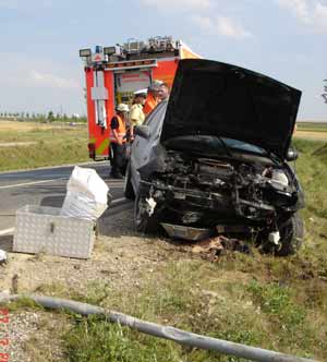 Am heutigen Nachmittag, gegen 16:30 Uhr, kam ein junger Fahrer mit seinem VW Polo auf der Ludwig-Erhard-Straße von der Fahrbahn ab, geriet in den Seitengraben und wurde zurück auf die Straße geschleudert. Dabei touchierte er einen Schildermast. Der Folgebrand, der sich im Motorraum des Fahrzeugs entwickelte wurde von einem anderen Autofahrer mit einem Pulverlöscher bis zum Eintreffen der Feuerwehr unter Kontrolle gehalten. Bis auf leichte Prellungen blieb der Fahrer unverletzt. Nach Abschluss der Löscharbeiten nahm die Feuerwehr auslaufende Betriebsstoffe auf und klemmte die Batterie ab.