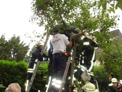 Am 07.07.2009, gegen 10:30 Uhr wurde die Feuerwehr zur Unterstützung des Rettungsdienstes angefordert. Beim Eintreffen der Feuerwehr an der Einsatzstelle befand sich in ca. 3 Meter Höhe eine männliche Person in einem Kirschbaum. Ein Mann hatte beim Kirschenpflücken einen Krampfanfall erlitten und sich dabei in einer Astgabel verfangen. Mit tragbaren Leitern und dem Gerätesatz Absturzsicherung wurde die Person zuerst gesichert. Anschließend wurde ein Großteil der Äste entfernt, um ihn ungehindert aus der Zwangslage befreien zu können. Während der Rettungsmaßnahmen wurde der Verunfallte durch den Rettungsdienst erstversorgt. Nach erfolgter Rettung wurde der Mann vom Rettungsdienst umgehend ins Krankenhaus gebracht.