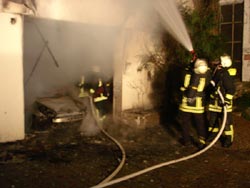 Am 07.07.2009, gegen 3:00 Uhr wurde die Feuerwehr zu einem Brand in die Wilhelmsstraße in Mainz-Bretzenheim gerufen. Beim Eintreffen der Feuerwehr an der Einsatzstelle brannte in einer Garage ein Fahrzeug in voller Ausdehnung. Der Brand hatte bereits auf die darüber liegende Wohnung und den Dachbereich übergegriffen. Zu diesem Zeitpunkt hatten alle Bewohner das vom Brand betroffene Gebäude bereits verlassen. Eine weibliche Person hatte sich dabei verletzt. Sie wurde vom Rettungsdienst erstversorgt und anschließend zur weiteren Behandlung ins Krankenhaus gefahren. Der Brand wurde durch die Einsatzkräfte der Feuerwehr, die mit Atemschutzgeräten ausgerüstet waren, schnell unter Kontrolle gebracht. Allerdings dauerten die Nachlöscharbeiten bis in die Vormittagsstunden an, da sich der Brand auch innerhalb der Zwischendecke in weitere Teile des Gebäudes ausgebreitet hatte. Es wurden Teile der Decke und des Fußbodens entfernt, um alle Glutnester endgültig löschen zu können. Mit einer Wärmebildkamera wurden alle angrenzenden Bereiche auf versteckte Glutnester hin kontrolliert. Um das Gebäude vom Brandrauch zu befreien, wurde ein Lüfter eingesetzt.