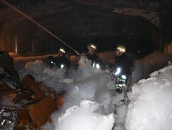 Im Verlauf der Nachlöscharbeiten endeckten die Einsatzkräfte, dass eine Dehnungsfuge in der Lagerhalle ebenfalls in Brand geraten war. Die Löscharbeiten an dieser Fuge gestalteten sich äußerst schwierig, da kaum an den eigentlichen Brandherd gelangt werden konnte. Der Einsatz eines Schwerschaumrohres brachte hier jedoch den gewünschten Erfolg und das Feuer konnte damit erfolgreich gelöscht werden. Eine Brandwache der Feuerwehr wird aus Sicherheitsgründen dennoch bis in die frühen Morgenstunden des heutigen Tages vor Ort bleiben und immer wieder Kontrollen in der Halle vornehmen.