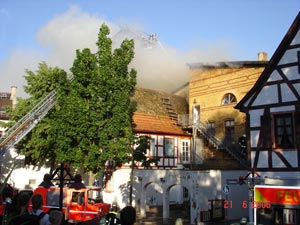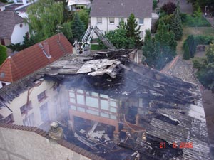 den stark entwickelten Gebäudebrand (Dachstuhlbrand). Im Laufe des Einsatzes