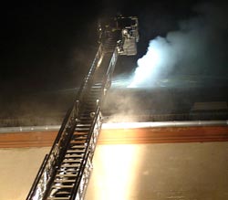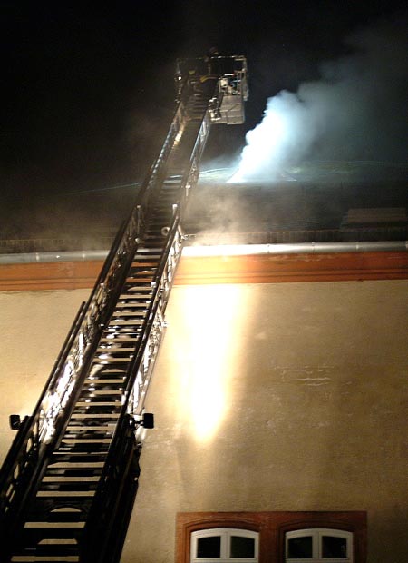 In der Nacht zum Sonntag wurde die Mainzer Feuerwehr, gegen 23.30 Uhr, in die Zitadelle gerufen, da ein Passant dort Rauch bemerkte. Der zuerst eintreffende Einsatzleiter stellte eine starke Rauchentwicklung aus dem dach des Bauteils C der Zitadelle fest. Ein Trupp der Berufsfeuerwehr drang, geschützt durch Atemschutzgeräte, über einen Treppenraum des Gebäudes in das Dachgeschoss vor und ergriff dort erste Löschmaßnahmen. Da ein Dachstuhlbrand des Gebäudes nicht auszuschließen war, wurde die Dachhaut von außen über die Drehleiter kontrolliert und ein Dachfenster geöffnet. Um den dichten Rauch aus dem Gebäude zu drücken wurde ein Hochdrucklüfter der Feuerwehr eingesetzt. nachdem die ersten Flammen gelöscht waren und der Rauch weniger wurde, war klar, dass sich der Brand im Bereich eines Flures entwicklet, aber nicht auf das Dachgebälk ausgebreitet hatte. Zur Bekämpfung des Brandes und der Nachlöscharbeiten wurdn insgesamt neun Feuerwehrmänner, darunter vier der Freiwilligen Feuerwehr Innenstadt, unter schweren Atemschutzgeräten eingesetzt. Die Ursache des Brandes ist zunächst noch unklar, die Polizei hat die Ermittlungen aufgenommen. Der Sachschaden wird derzeit von der Feuerwehr auf 20.000,- € geschätzt.