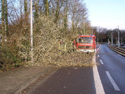 Eine besorgte Bürgerin rief am Mittwoch nachmittag bei der Feuerwehr an und meldete, dass in Mainz-Gonsenheim in der Straße Am Sportfeld in einem kleinen Waldstück in der Nähe eines Abenteuerspielplatzes mehrere Bäume umgefallen seien. Sie befürchtete deshalb eine Gefahr für dort spielende Kinder. Von der Feuerwehr wurde die Einsatzstelle begutachtet und man entschied sich daraufhin, einen halb umgefallenen Baum, einen sogenannten "Hänger" komplett zu fällen und damit die Gefahr zu beseitigen. Ursache war vermutlich der Sturm "Emma" vom vergangenen Samstag.