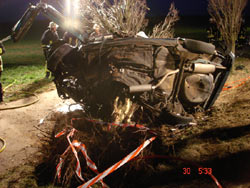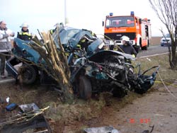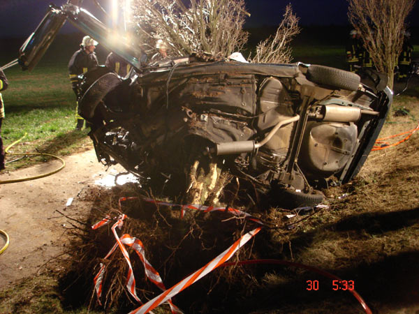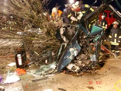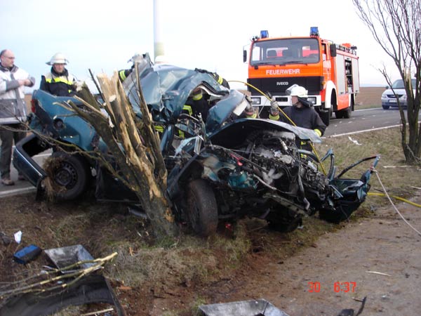 Auf Höhe der Windkraftanlage in Ebersheim war aus unbekannter Ursache ein PKW von der Fahrbahn abgekommen und seitlich in einen Baum gefahren. Von den beiden 27 und 22 Jahre alten Insassen war der Beifahrer in Folge des Aufpralls sofort verstorben. Der schwer verletzte Fahrer wurde von der Feuerwehr mit hydraulischem Rettungsgerät befreit und dem Rettungsdienst übergeben. Anschließend wurde der tote Beifahrer geborgen. Rettung und Bergung gestalteten sich sehr aufwendig und schwierig, da das Fahrzeug sehr stark deformiert wurde. Durch die Wucht des Aufpralls wurde das Fahrzeug samt Baum umgerissen. Stamm und Äste des Baumes hatten sich dabei in das Fahrzeug gebohrt und verkeilt. Während der Arbeiten wurde die Straße von der Polizei voll gesperrt. Nach zweieinhalb Stunden war die Arbeit der Feuerwehr so weit beendet. Die Polizei hat die Ermittlungen aufgenommen.