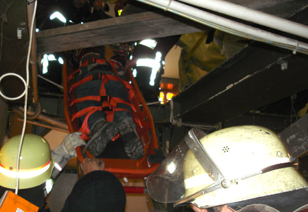 Gegen zehn Uhr am heutigen Vormittag stürzte ein Bauarbeiter bei Abrissarbeiten im Krematorium in einen ca. 2,50 m tiefer gelegenen Bereich.