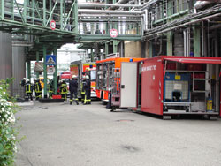 Daraufhin wurden zahlreiche Einheiten der Berufsfeuerwehr sowie der Freiwilligen Feuerwehren zur Einsatzstelle beordert. Die Kräfte der Betriebsfeuerwehr hatten bei Eintreffen der Berufsfeuerwehr bereits Hydroschilde zum Niederschlagen des Gefahrstoffes aufgestellt und die Einsatzstelle weiträumig abgesperrt.