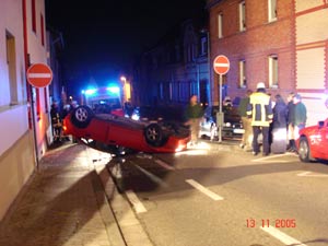 Am 13.11.2005, um 03.24 Uhr wurde die Feuerwehr zu einem Verkehrsunfall in die Albert-Stohr-Straße gerufen. Aus noch unbekannter Ursache fuhr eine junge Fahrerin gegen ein geparktes Fahrzeug. Dabei geriet ihr Fahrzeug so außer Kontrolle, dass es sich überschlug und auf dem Dach liegen blieb. Vor dem Eintreffen der Feuerwehr konnte sich die unter Schock stehende Fahrerin mit eigener Kraft aus dem Fahrzeug befreien. Sie wurde anschließend vom Rettungsdienst versorgt und in eine Klinik gebracht. Die Einsatzkräfte der Feuerwehr stellten das Fahrzeug wieder auf die Räder, klemmten die Fahrzeugbatterie ab und nahmen ausgelaufene Betriebsstoffe auf. Nach eigener Einschätzung entstand an beiden Fahrzeugen Totalschaden.