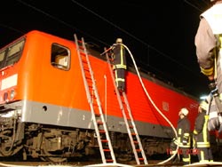 Am Sonntag, 15.10.2006, gegen 18:30 Uhr wurde die Feuerwehr von der Notfallleitstelle der Bundesbahn zu einer brennenden E-Lok alarmiert. Die Lok befand sich auf einer Rangierfahrt und wurde von dem Lokführer noch auf ein Abstellgleis in der Nähe des Hauptbahnhofes gefahren. Der Zugverkehr blieb so unbeeinträchtigt. Beim Eintreffen der Berufsfeuerwehr und der FF Stadt qualmte die Lok aus dem Führerstand. Es brannte der Antriebsmotor in einem Lüftungsschacht. Nachdem der Strom des betroffenen Gleises abgeschaltet und der Fahrdraht geerdet war, wurde der Motor mit Wasser aus einem C-Strahlrohr gekühlt. Sicherheitshalber wurden mehrere CO2-Feuerlöscher in Bereitstellung genommen. Im weiteren Verlauf des Einsatzes wurde ein weiteres C-Strahlrohr vorgenommen, um die Lok von außen zu kühlen. Mit mehreren Flutlichstrahlern wurde die Einsatzstelle ausgeleuchtet. Nachdem Verkleidungsteile des Schachtes demontiert waren, konnte der Elektromotor mit Wasser endgültig gelöscht werden. Abschließend wurde die Lok in einen Lokschuppen geschleppt. Die FF Mombach wurde zur Wachbesetzung auf der Feuerwache 2 eingesetzt. Die Schadenshöhe lässt sich zum momentanen Zeitpunkt nch nicht beziffern.