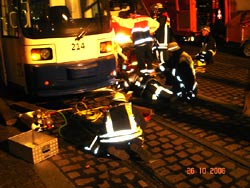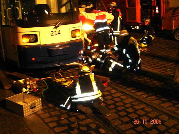 Am Donnerstag, den 26.10.2006 gegen 22.45 Uhr wurde die Feuerwehr Mainz zum Schillerplatz alarmiert. Eine männliche Person war aus ungeklärter Ursache unter den vorderen Bereich eines Straßenbahnwagens geraten und lag kurz vor den Vorderrädern. Der Brustkorb des Mannes war durch den Wagen belastet, so dass er nicht befreit werden konnte. Auch stand er unter Schock. Der Rettungsdienst stabilisierte den Kreislauf des Mannes, sodass die Feuerwehr mit Hebekissen den Wagen im vorderen Bereich anheben konnte. So konnte der Verunfallte schon wenige Minuten später befreit werden. Er wurde zur weiteren Behandlung dem Rettungsdienst übergeben.