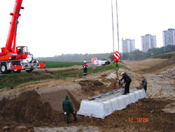 Bombe vom Kranwagen auf einen LKW des Kampfmittelräumdienstes verladen.