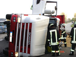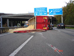 Sojaschrott beladene Sattelzug um und blieb auf der linken Fahrspur an der Leitplanke