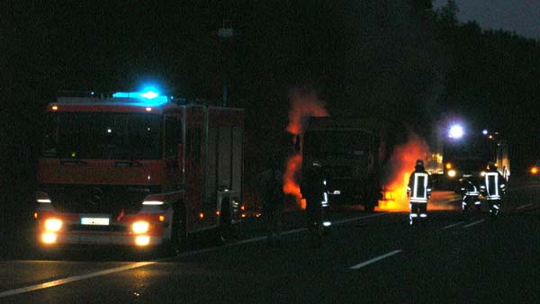Aus noch ungeklärter Ursache kam es am frühen Samstagmorgen auf der A63 in Fahrtrichtung Kaiserslautern zu einem Lkw-Brand. Beim Eintreffen der Feuerwehr stand das Gespann auf dem Seitenstreifen. Die Zugmaschine brannte im Bereich des Fahrgestelles unter dem Kastenaufbau in voller Ausdehnung. Mittels Verwendung der Schnellangriffsrohre zweier wasserführender Löschfahrzeuge konnte der Brand durch einen Trupp unter unluftunabhängigen Atemschutz gelöscht werden. Glücklicherweise war die Zugmaschine nicht beladen. Dennoch musste zum endgültigen Ablöschen der verbliebenen Glutnester in der Ladefläche diese teilweise entfernt werden. Trotz des anfänglichen Aufgebotes von fünf Feuerwehrfahrzeugen waren letztlich doch nur zwei Großfahrzeuge notwendig, sodass die nachrückenden Kräfte der Freiwilligen Feuerwehr Bretzenheim wieder den Heimweg antreten konnten. Die Sperrung der nach Kaiserslautern führenden Fahrbahn war nur kurzfristig notwendig. Während des rund einstündigen Einsatzes floss der Verkehr auf einer Spur weiter.