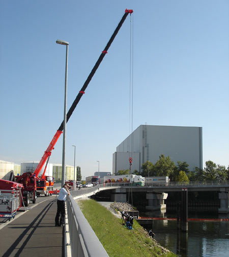 Als der angeforderte 160 to. Kran den Auflieger behutsam aus dem Gleisbett hob, wurden die Beschäftigten der direkt angrenzenden Betriebe vorsorglich kurzzeitig evakuiert. Die Bergung verlief komplikationslos.