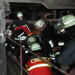 ein Feuerwehrmann den Verletzten erreichen. Der Verletzte und der vordringende