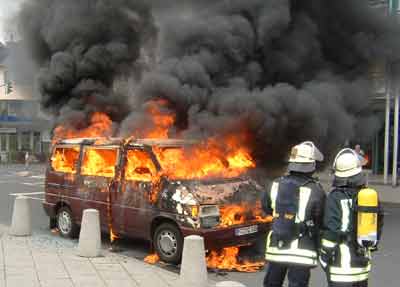 Am Montag um 11.35 Uhr wurde die Berufsfeuerwehr zu einem PKW-Brand in der Dagobertstraße/ Mainz-Innenstadt alarmiert. Vor Ort brannte ein VW-Bus in voller Ausdehnung. Zwei Trupps unter Atemschutz löschten den PKW- Vollbrand mit zwei C-Rohren. 15 Minuten nach der Alarmierung konnte "Feuer aus" gemeldet werden.