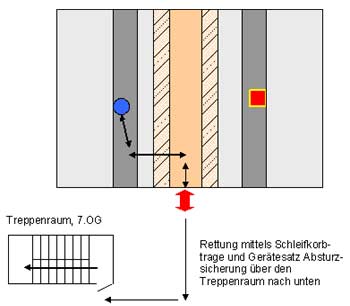Anzumerken bleibt, dass die zahlreichen Ausbildungseinheiten der Feuerwehr im Bereich der Höhensicherung dem Einsatz zu Gute kamen. Sowohl bei der Rettung der verletzen Person aus dem Schacht, als auch bei dem anschließenden Ablassen aus dem 7. OG auf Erdgleiche wurde der Gerätesatz Höhensicherung erfolgreich eingesetzt. Dieser spezielle Ausbildungszweig wird auch durch die Erfahrungen dieses Einsatzes bei der Feuerwehr weiterhin verfolgt werden.