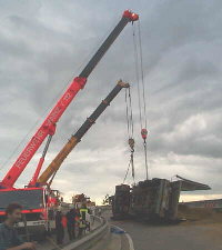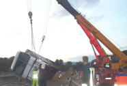 Um den LKW aufrichten zu können, musste der Sattelauflieger zunächst entladen werden. Die Feuerwehr wurde dabei von einer Bergungsfirma, die mit einem Kranwagen und einem Radlader hinzu alarmiert worden war, unterstützt. Zusammen mit dem Kranwagen der Feuerwehr konnte der LKW schließlich aufgerichtet werden. Für die Bergungsarbeiten waren Auf- und Abfahrt bis gegen 22.30 Uhr voll gesperrt. Die Aufräumarbeiten unter Auffahrt dauerten noch bis gegen Mitternacht. Die Ladung wurde unter der Brücke vorübergehend zwischengelagert. Der geschätzte Sachschaden beläuft sich auf etwa 85.000 Euro.