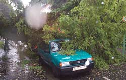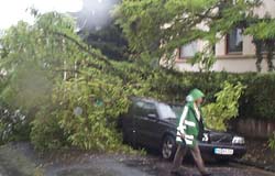 Am Samstag , 14.06.2003 zog gegen 14:00 Uhr ein heftiges Unwetter über das Stadtgebiet von Mainz. Besonders betroffen waren die Stadtteile Ebersheim und Laubenheim. An 9 Einsatzstellen wurden Kräfte der Freiwilligen Feuerwehren aus den betroffenen Stadtteilen und der Berufsfeuerwehr tätig. Es wurden Kanaldeckel wieder eingesetzt und Straßen gereinigt. In der Straße "Bastion Philipp" wurden 2 PKW durch Teile eines umgestürzten Baumes beschädigt.Personen kamen nicht zu Schaden. Die Höhe der Sachschäden kann zur Zeit noch nicht beziffert werden.