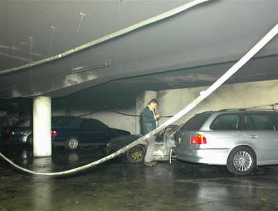 Aus unbekannter Ursache gerieten am frühen Samstag Morgen (5:50 Uhr) zwei PKW in der untersten Ebene des City-Port-Parkhauses am Hauptbahnhof in Brand. Beim Eintreffen der Feuerwehr drang dichter schwarzer Rauch aus der Auffahrt der untersten Ebene. Sofort gingen zwei Trupps unter Atemschutz mit einem C-Rohr in den betroffenen Bereich vor. Da durch den dichten Rauch keinerlei Sicht möglich war, wurde eine Wärmebildkamera eingesetzt. Zwei brennende PKW wurden gefunden und abgelöscht. Anschließend wurde mit drei Hochdrucklüftern die Ebene entraucht. Gegen 8:00 Uhr war der Einsatz beendet. Die Kripo hat die Ermittlungen aufgenommen.Die Ebene wurde komplett von einem Mainzer Autohaus gemietet. Knapp 25 Luxuskarossen einer bayerischen Nobelmarke waren dort abgestellt. Zwei PKW sind direkt ausgebrannt. Mehrere Andere wurden beschädigt. Am Parkhaus selbst entstand ebenfalls erheblicher Schaden. Der Sachschaden dürfte in die Millionen gehen.Die Freiwillige Feuerwehr Mainz-Innenstadt besetzte während des Einsatzes die Feuerwache 2, Barbarossaring. Dienstfreie Kräfte der Berufsfeuerwehr wurden ebenfalls verfrüht zum Dienst gerufen.