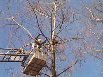 In der Nacht zum Montag waren im Wildpark Gonsenheim zwei Waschbären entlaufen. Eins der Tiere entdeckte ein Pfleger des Wildparks in einem nahegelegenen Baum. Er versuchte es zunächst mit einer Anstellleiter, aber als sich der Pfleger dem Tier näherte, kletterte der Waschbär noch weiter den Baum hinauf. Daraufhin rief der Pfleger die Feuerwehr an und bat um Hilfe. Um 9.45 Uhr wurde der Einsatzleitwagen und die Drehleiter alarmiert. Mit der Drehleiter konnte man glücklicherweise sehr dicht an den Baum heranfahren. Zusammen mit dem Tierpfleger versuchte Hauptbrandmeister Norbert Singer jetzt, das Tier vom ausgefahrenen Leiterkorb aus einzufangen. Doch diese Aktion gestaltete sich sehr schwierig, da das Tier zwar an seinem Platz verblieb sich aber heftigst wehrte und sehr aggressiv wurde. Mit der bloßen Hand war ein Einfangen unmöglich. Schließlich nahmen sie einen großen Casher und es gelang ihnen, den Waschbären damit einzufangen. Er wurde dann sofort wieder in sein Gehege zurückgebracht. Das Tier blieb unverletzt, nur der Pfleger hatte eine kleine Bisswunde erlitten und dass, obwohl er zwei Handschuhe übereinander getragen hatte, davon einen Kettenhandschuh! Der zweite entlaufene Waschbär wurde übrigens noch nicht gefunden.
