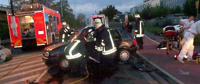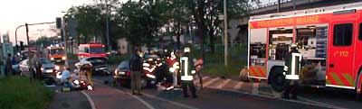 Am Morgen des 01. Mai wurde die Feuerwehr um 5.35 Uhr in die Rheinallee gerufen. In Höhe der Fa. Schott Ceran stieß ein auf der Rheinallee fahrender Audi TT mit einem aus dem Werk kommendem VW Golf zusammen. In dem Golf wurden drei Frauen schwer verletzt. Eine Frau musste durch die Mainzer Berufsfeuerwehr mit hydraulischem Rettungsgerät befreit werden. Die Insassen des Audi blieben unverletzt. Die Verletzten wurden durch den Rettungsdienst und den Notarzt in die Mainzer Kliniken gebracht.