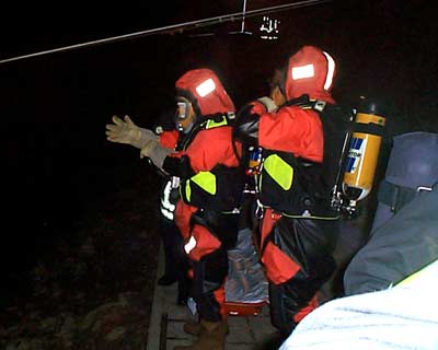 Rüstzug und dem Feuerwehrkran aus und erkundete zusammen mit dem Bundesgrenzschutz,