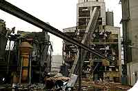 für die Feuerwehr Mainz bevorstand. Die Fraktionieranlage, in der Sojaschrot unter Verwendung von Leichtbenzin ausgewaschen wird, brannte in voller Ausdehnung. | ![]() |