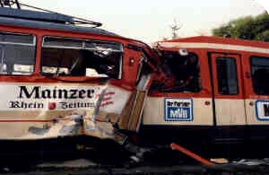 Feuerwehr Mainz: Einsätze1989- Zusammenstoß zweier StraßenbahnenAuf dem eingleisigen Straßenbahnstreckenabschnitt zwischen den Haltestellen